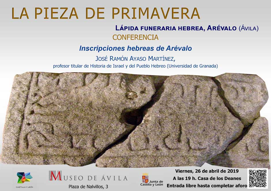 El próximo viernes 26 a las 19 horas, el Museo de Ávila (Plaza de Nalvillos, 3) acogerá la celebración de la conferencia Inscripciones hebreas de Arévalo, a cargo de José Ramón Ayaso Martínez, profesor titular de Historia de Israel y del Pueblo Hebreo de la Universidad de Granada, con motivo de la presentación de la nueva Pieza de Primavera, una lápida funeraria hebrea procedente de la localidad de Arévalo.